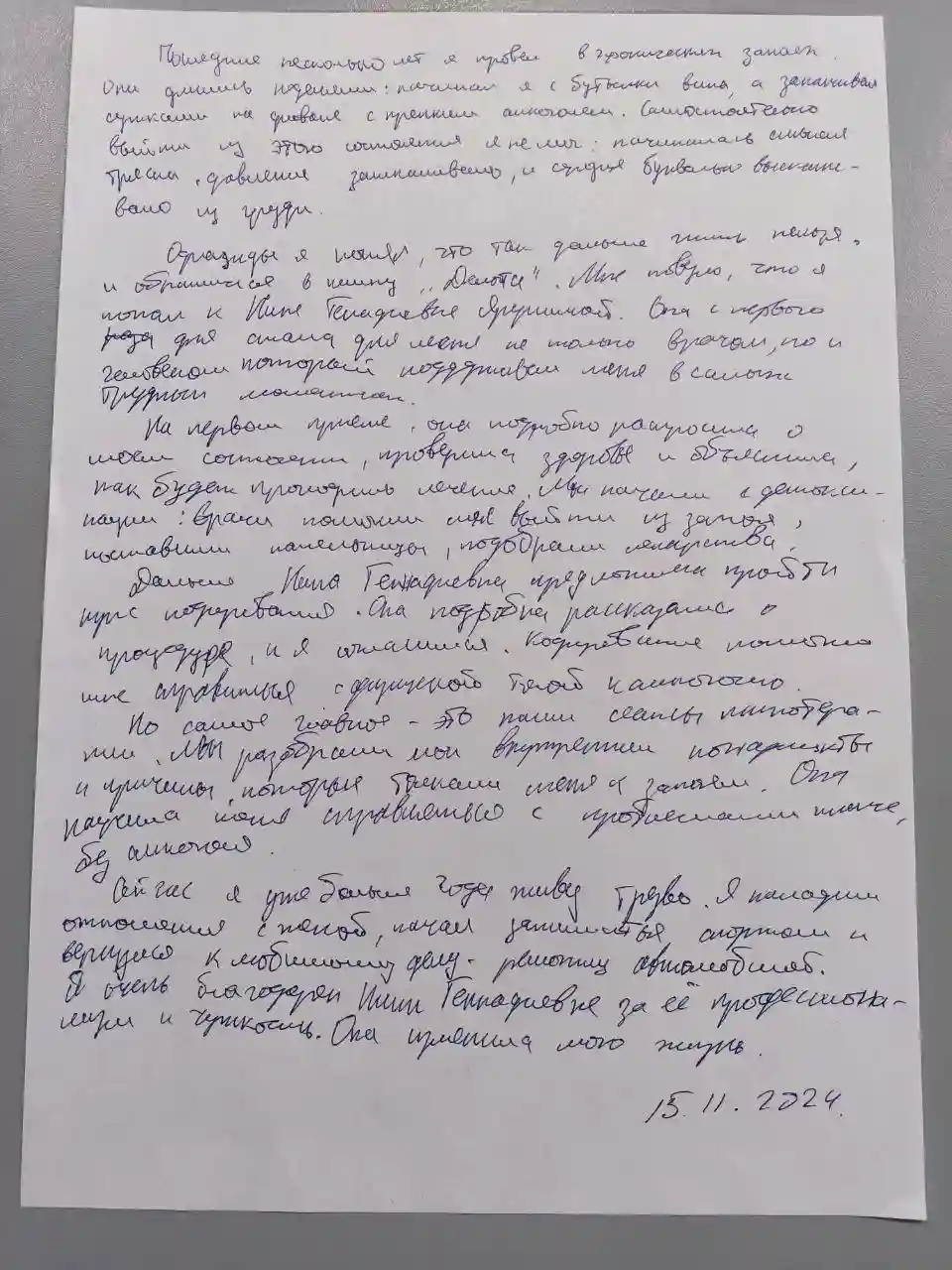 Сейчас я не пью уже больше года. Моя жизнь изменилась: я восстановил отношения с семьёй, у меня появились силы заниматься спортом, а на работе я получил повышение. Я не могу передать словами, насколько я благодарен Нине Геннадиевне за её терпение и профессионализм. Она буквально спасла меня.